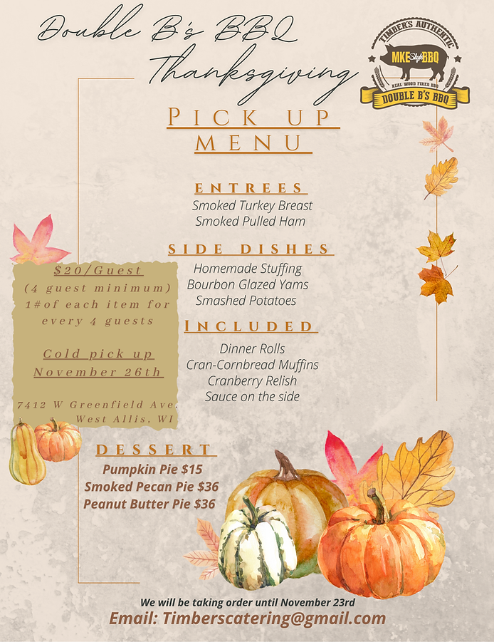 To place your order, simply email us at TimbersCatering@gmail.com. We offer a variety of traditional Thanksgiving dishes that will delight your guests, from tender turkey and savory stuffing to flavorful sides and sweet pies.